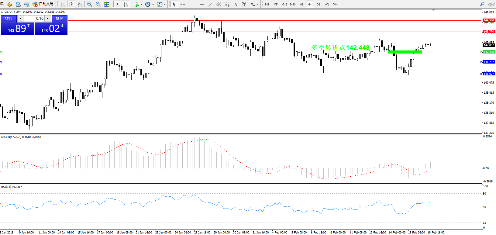 交易策略:142.448上方看涨,目标143.770、144.500