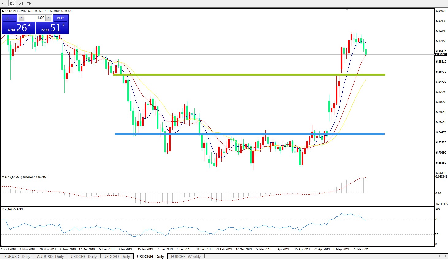 技术面简析:日线短期均线开始拐头下行MACD0轴上方运行但动能柱有缩量迹象RSI超买区域下行,汇价强力上攻后乏力下行,预计短期汇价有下行回踩需求,中期重点关注中美贸易争端后续进展
