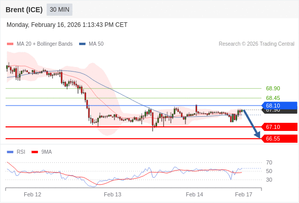 布伦特原油 (ICE) (J6) 当日内: 短期关键阻力位在68.10。