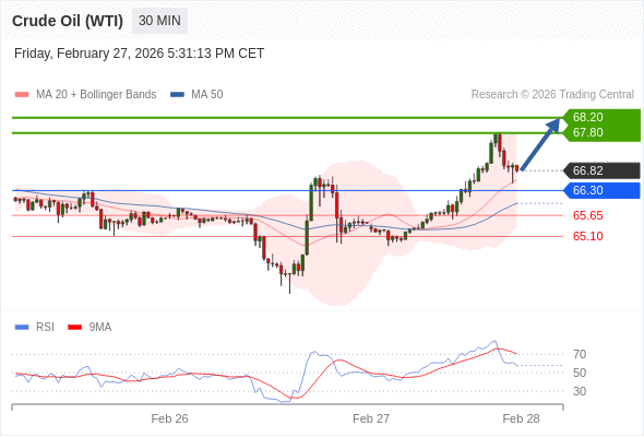 在 65.65 之上,看涨,目标价位为 67.80 ,然后为 68.20 。
