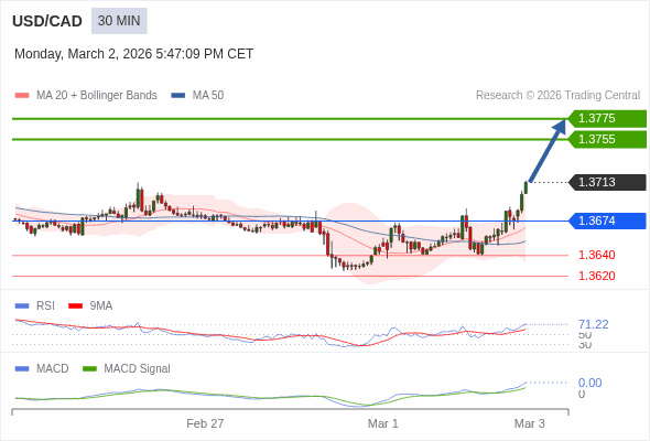 美元/加元 当日内 : 看涨,当 1.3674 为支撑位。