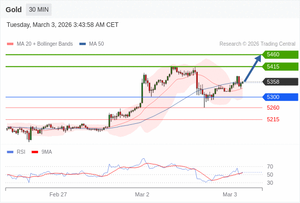 交易策略: 在 5300 之上,看涨,目标价位为 5415 ,然后为 5460 。