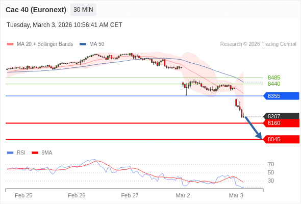 法国CAC指数期货 (Euronext) (H6) 当日内: 存在压力。