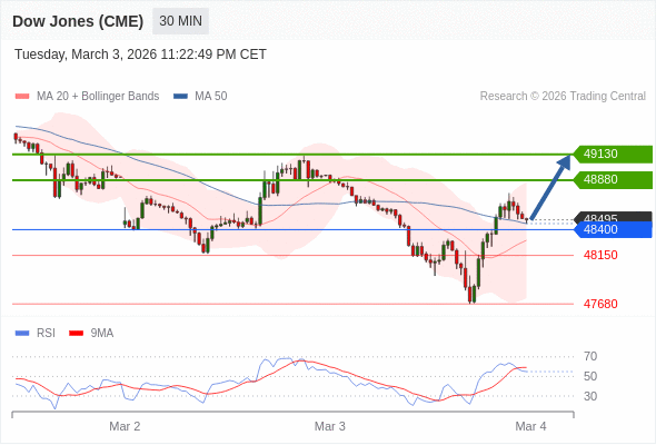 在 48400 之上,看涨,目标价位为 48880 ,然后为 49130 。