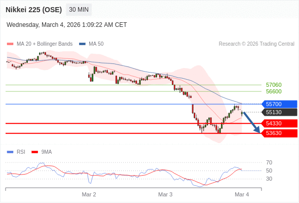 在 55700 之下,看跌,目标价位为 54330 ,然后为 53630 。
