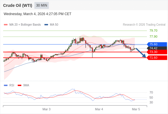 在 75.60 之下,看跌,目标价位为 73.30 ,然后为 71.60 。