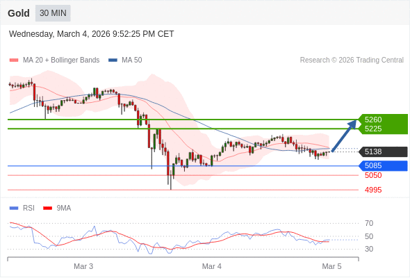 交易策略: 在 5085 之上,看涨,目标价位为 5225 ,然后为 5260 。