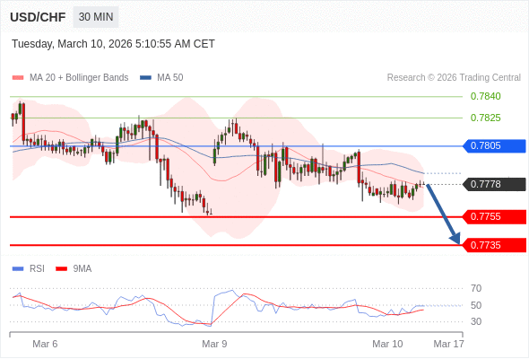 美元/瑞郎 当日内: 目标位为0.7755。