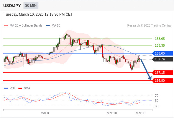 在 158.00 之下,看跌,目标价位为 157.15 ,然后为 156.80 。