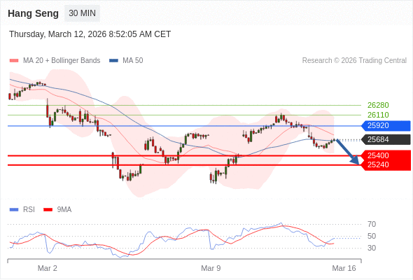 恒生指数 当日内: 朝25240运行。