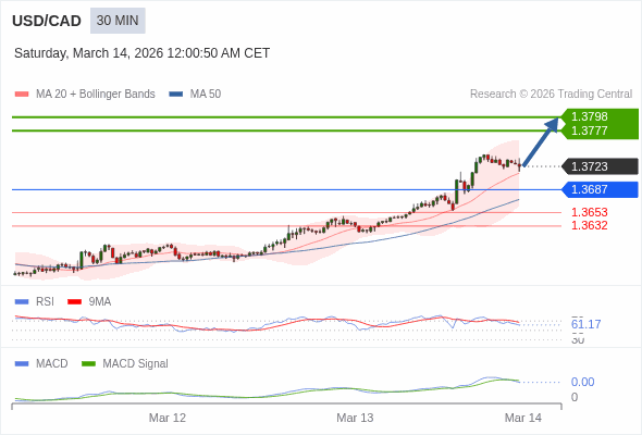 美元/加元 当日内 : 看涨,当 1.3687 为支撑位,目标定在1.3798。