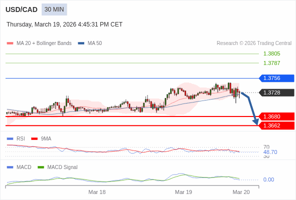 美元/加元 当日内 : 逐渐下跌,当 1.3756 阻碍上行,则 1.3662 为目标位。