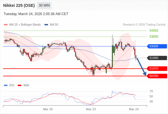 在 53000 之下,看跌,目标价位为 51070 ,然后为 50430 。