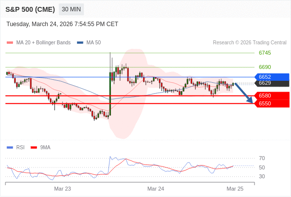 在 6652 之下,看跌,目标价位为 6580 ,然后为 6550 。
