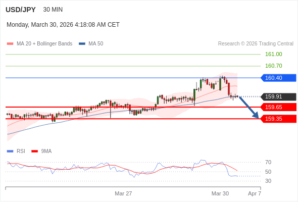 交易策略: 在 160.40 之下,看跌,目标价位为 159.65 ,然后为 159.35 。