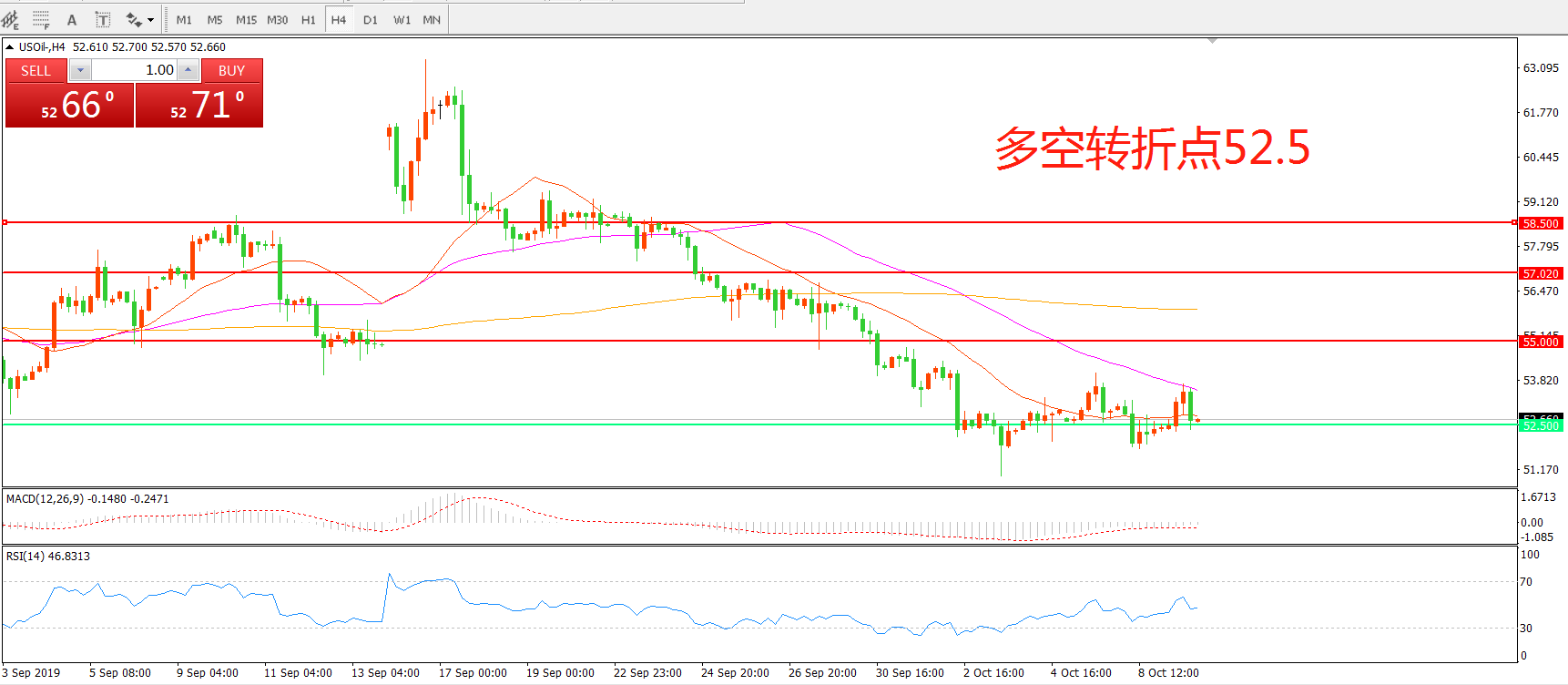 周三(10月9日),北京时间22:30,美国EIA公布的数据显示,美国当周EIA原油库存增加292.70万桶,高于预期的增加171.7万桶,但精炼油库存和汽油库存同步出现减少,这与API库存表现是一致的。成品油库存的减少抵消了原油库存增加的利空,油价呈现窄幅震荡形态, 美国WTI原油最终呈现窄幅震荡,最终收报52.40美元/桶,市场仍在等待中美谈判方面消息的进一步指引。