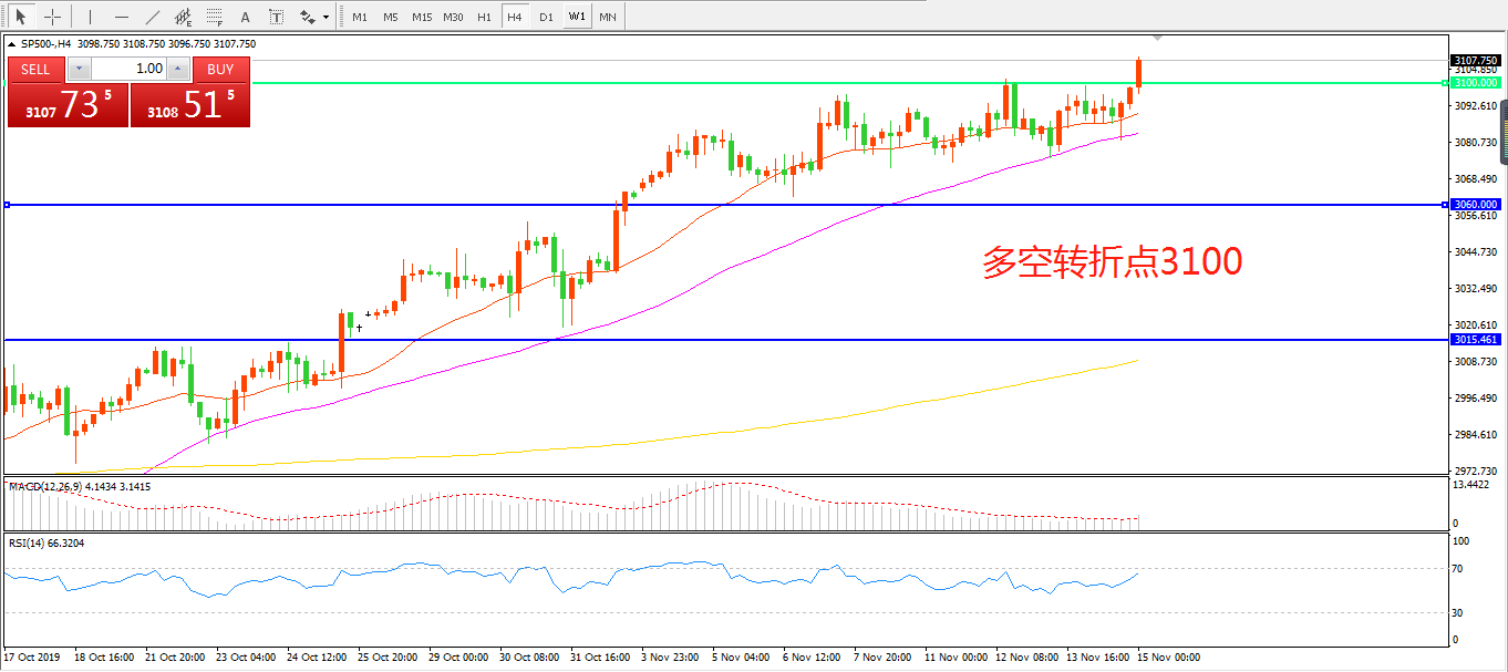 4小时图看,标普500连续上涨后小幅下行,55周期成为短期支撑,整体来看依然处于多头趋势,但MACD红柱缩短,RSI指标下行,需警惕短期回落风险。