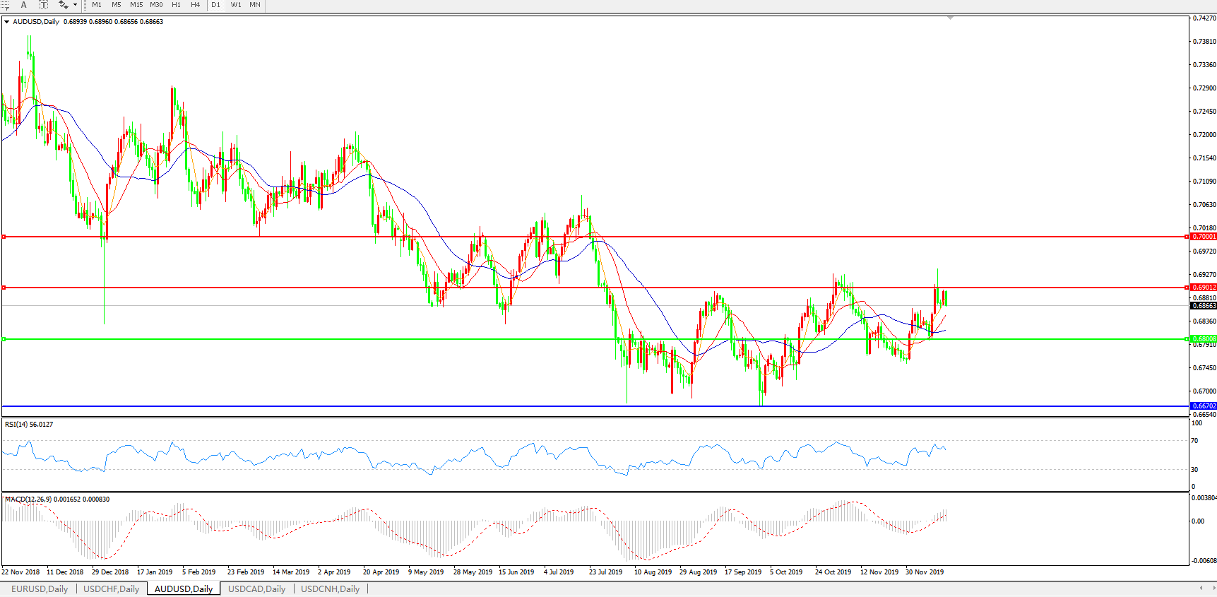 澳元兑美元在周一日内震荡小幅下跌,走势依旧疲软。上周五,在全面贸易领域最新出现了阶段性尘埃落定的消息后,澳元却因相关消息影响已经被提前透支而未能再续涨势,反而因而美元指数的反弹而跳跌,再度失守0.69关口;分析人士指出,虽然澳元走势仍然在相当程度上受到外部贸易局势的影响,但上周以来其汇价的涨势已经充分计入了该方面的影响,而眼下,市场依旧在担忧澳洲本国的经济状况,并且澳洲联储明年继续降息的预期也无法继续排除,这使得澳元走势依旧压力巨大;并且,上周五澳元兑美元虽然短暂上破200日均线,但最终仍陷入”魔咒“之中,未能在收盘站稳于其切入位0.6911上方,于是,过去一年半以来的下行通道趋势依旧完好,在尝试反转失败后,澳元兑美元后市将有大概率重返下跌趋势,短期内10日均线切入位0.6854尤为直到关注