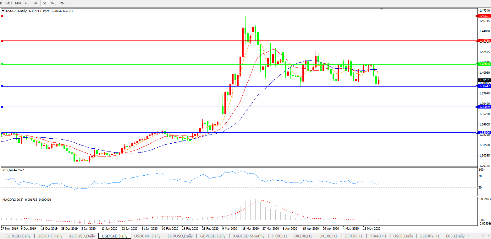 技术面简析:日线图均线全线走弱,汇价跌破1.40关口并不断下行,MACD走平且量能几无,RSI小幅走弱,预计短期汇价或将进一步走低,关注上方1.3845附近支撑。