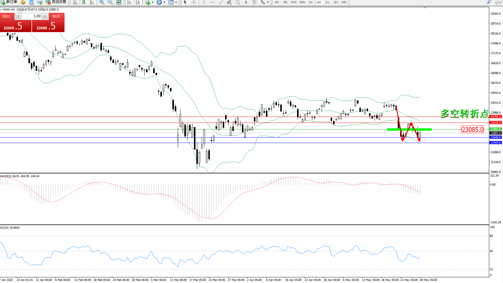 香港恒生指数528日(周四)收盘下跌168.60点,跌幅0.72%,报23132.76点;港股市场疲弱,恒指盘中一度跌超2%,南下资金净流出3.2亿港元,大市成交额为1326.99亿港元。煤炭股、黄金股逆势走强,中国神华涨超2%;网传第三轮带量采购最快7月启动,医药股全线下挫,石药集团大跌超10%领衔下跌;半导体、生物科技、软件股跌幅居前。港股仍然缺乏方向,但在负利率环境下,避险股仍首选内银股。眼下的这场新冠疫情已经造成了损失,各国刺激计划将是关键所在;在全球经济存在巨大不确定性之际,2020年吸引海外投资的竞争将更加激烈。
