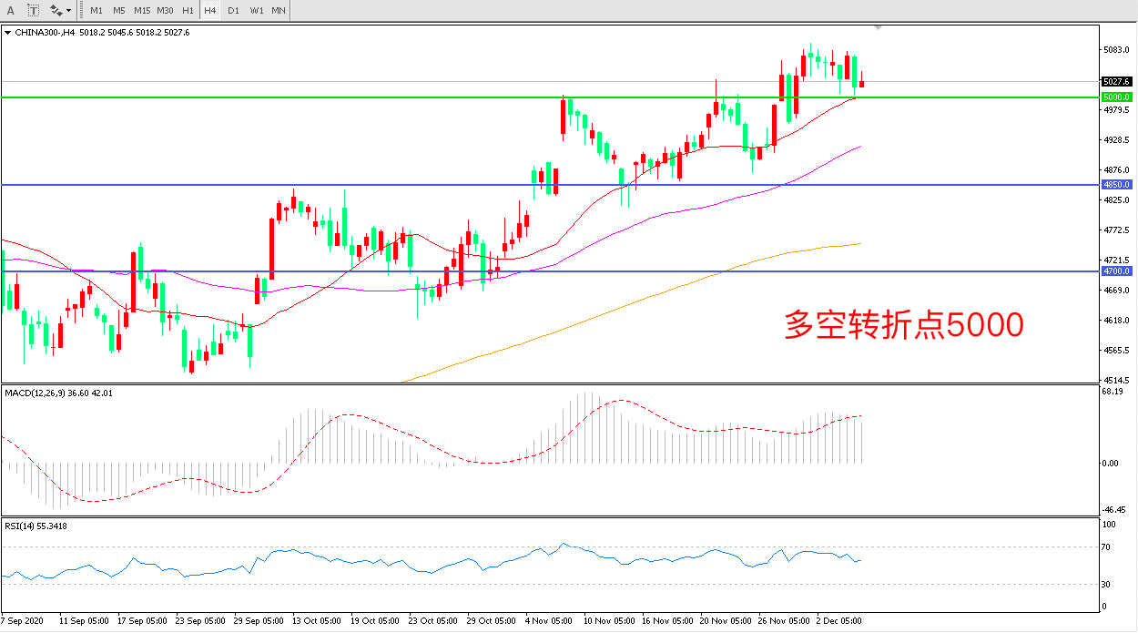 4小时图看,沪深300延续高位震荡,短期走势仍然坚挺,均线系统依然呈多头排列,5000成为下方支撑,MACD红柱增加,RSI指标走平,日内延续震荡概率较大。