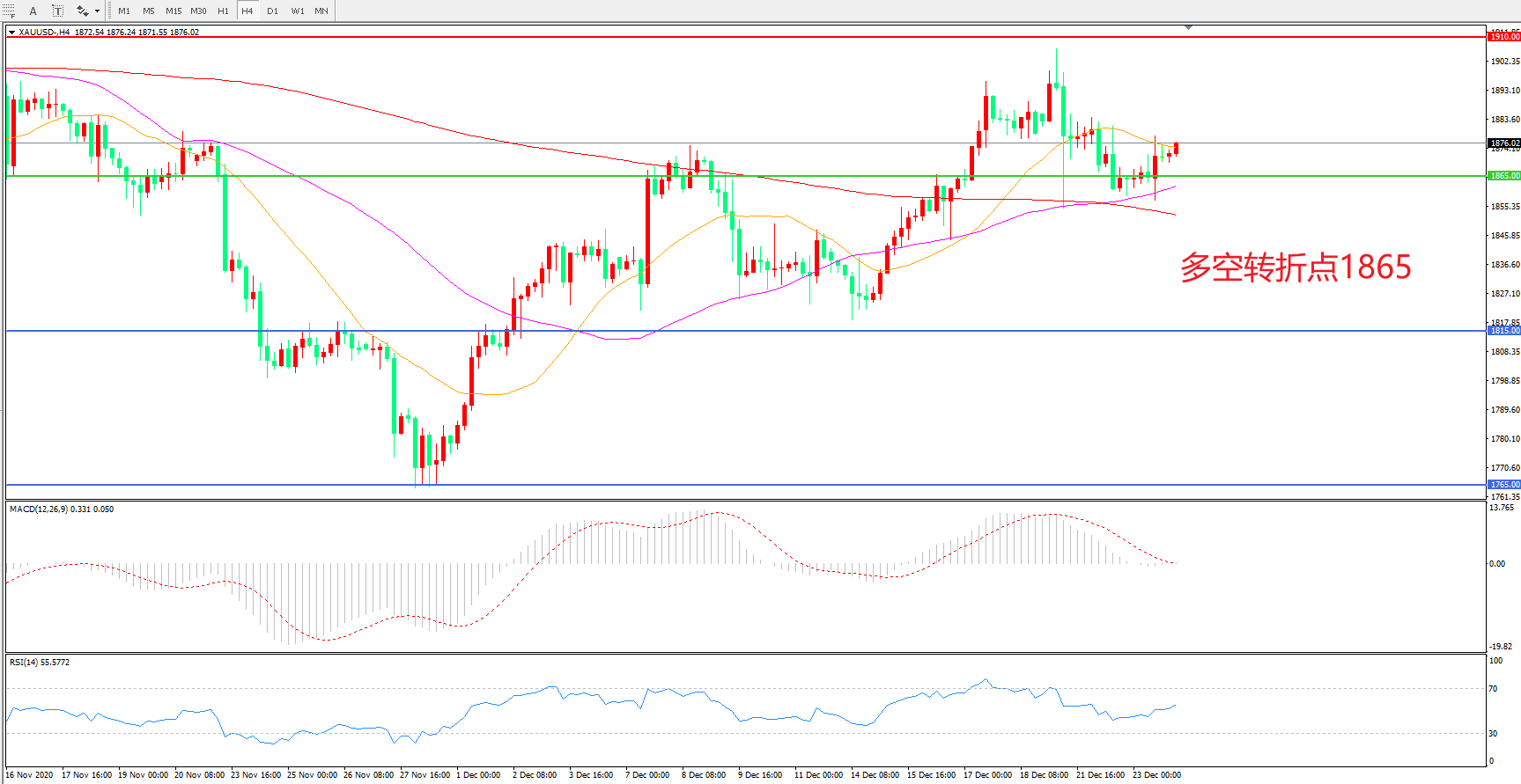 周三(12月23日),在美国总统特朗普出人意料地要求修改国会通过的疫情纾困法案之后,美指震荡下行,最终收于90.35点,现货黄金小幅反弹,收报1873.35美元/盎司。美国国会推出新一轮财政刺激计划以及新冠疫苗取得积极进展成为近期影响美国经济复苏前景的利好消息,但疫情的阴霾正使市场重新回归避险。