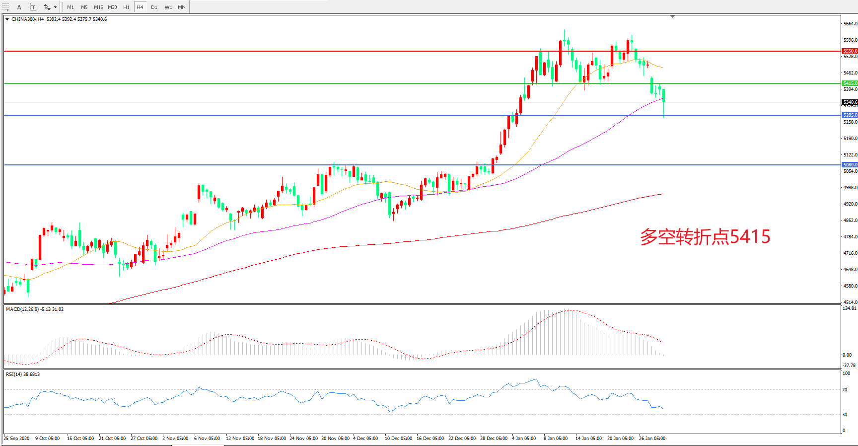 交易策略: 在5415.00之下看跌,目标5285.00    5080.00