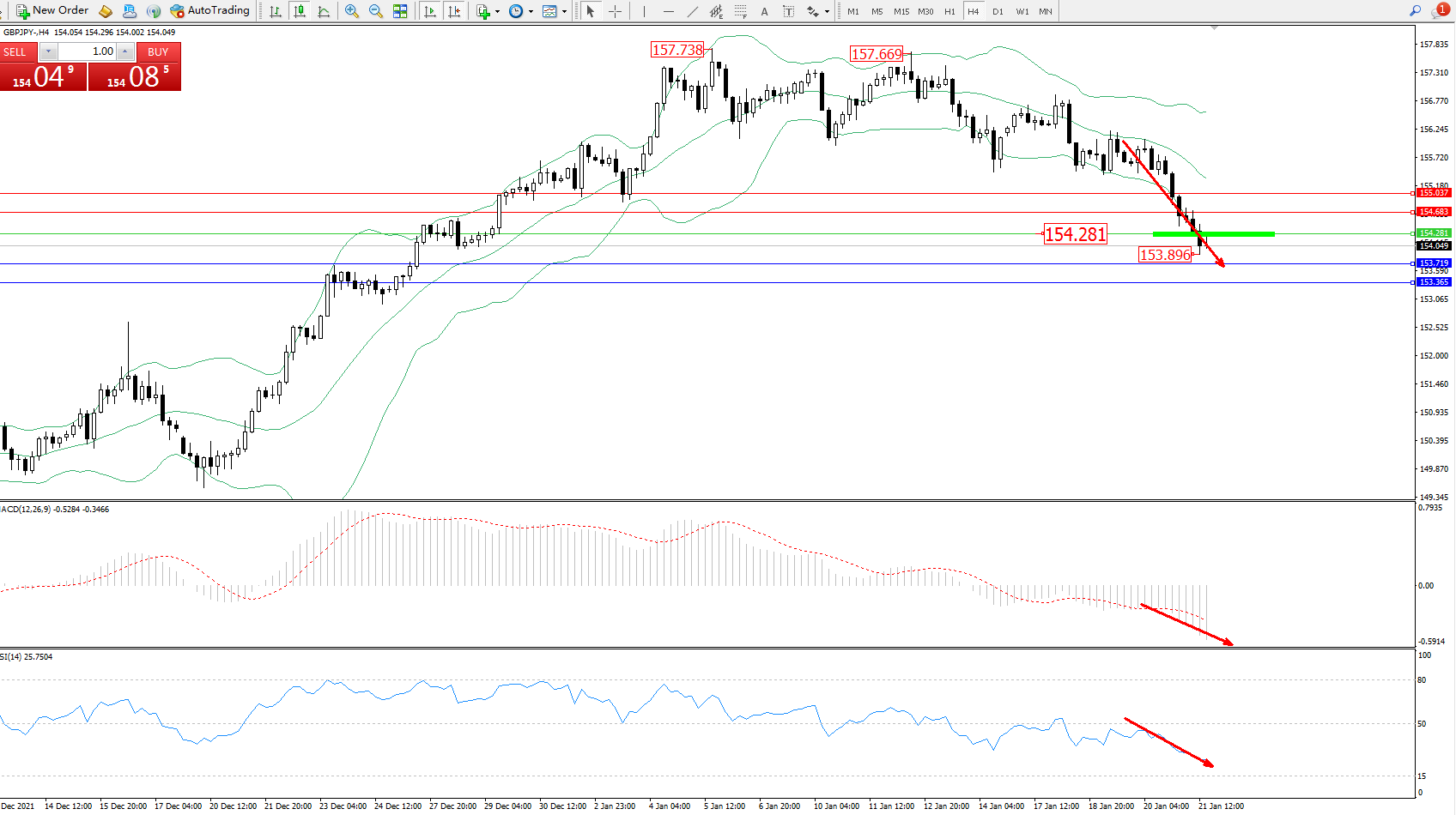 交易策略:154.281下方看跌,目标153.719、153.365