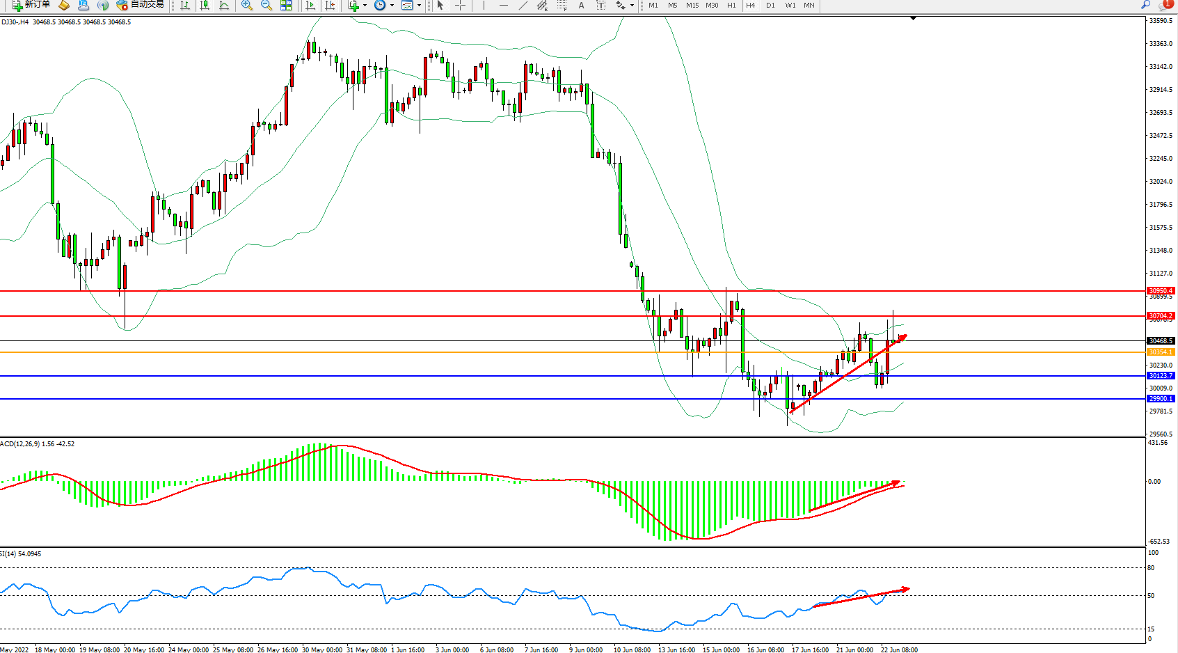 道琼斯指数DJ30——4小时K线图显示: