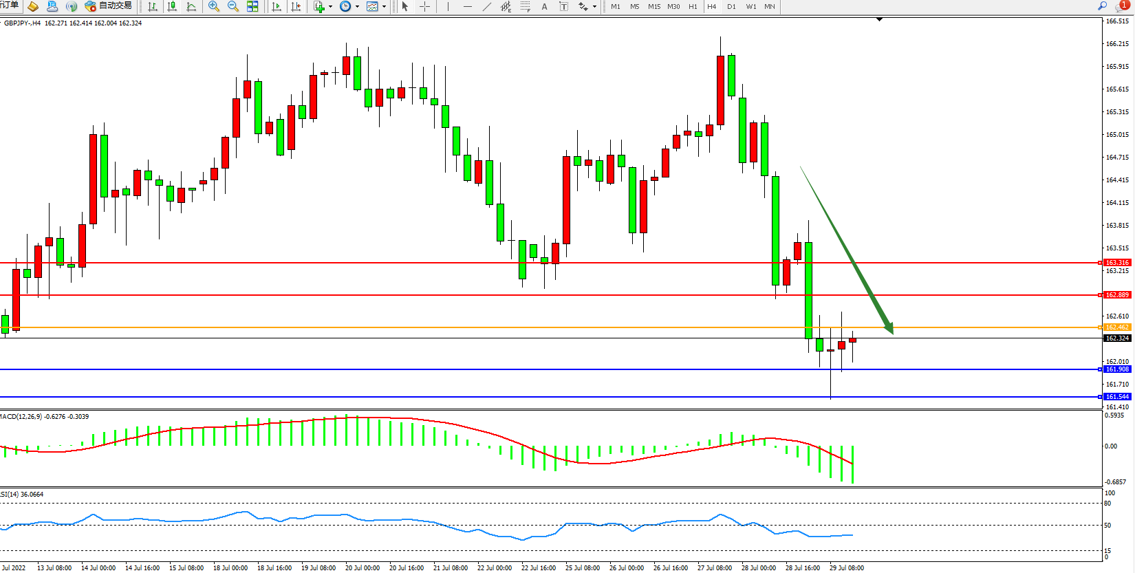交易策略:162.462下方看跌,目标161.908、161.544