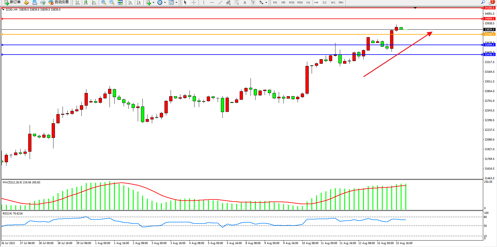 道琼斯指数DJ30——4小时K线图显示: