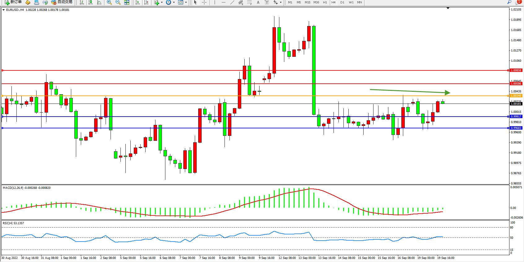 交易策略:1.00340下方看跌,目标0.99917、0.99683
