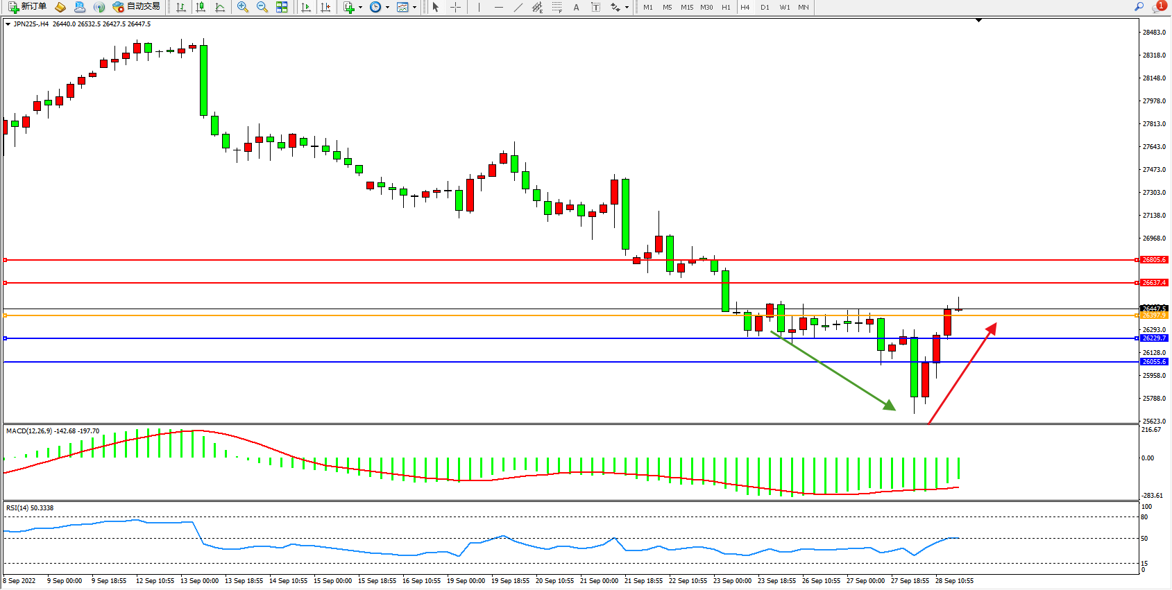 日经指数JPN225——4小时K线图显示: