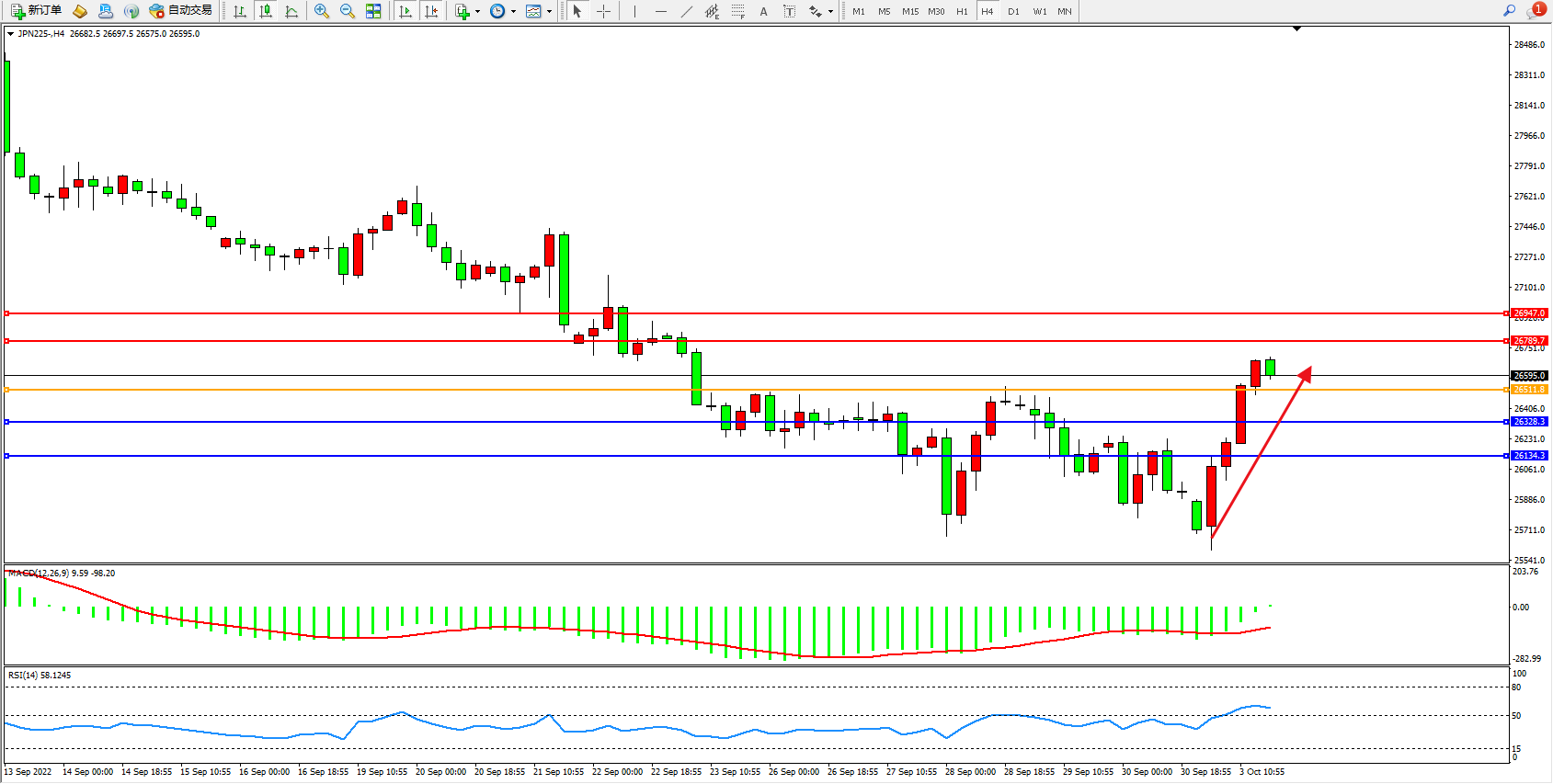 日经指数JPN225——4小时K线图显示: