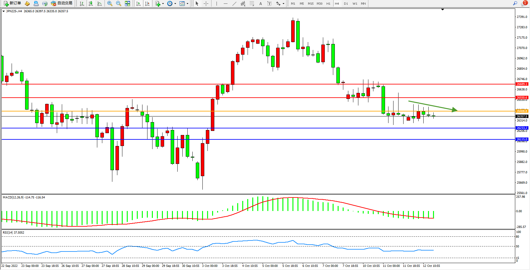 日经指数JPN225——4小时K线图显示: