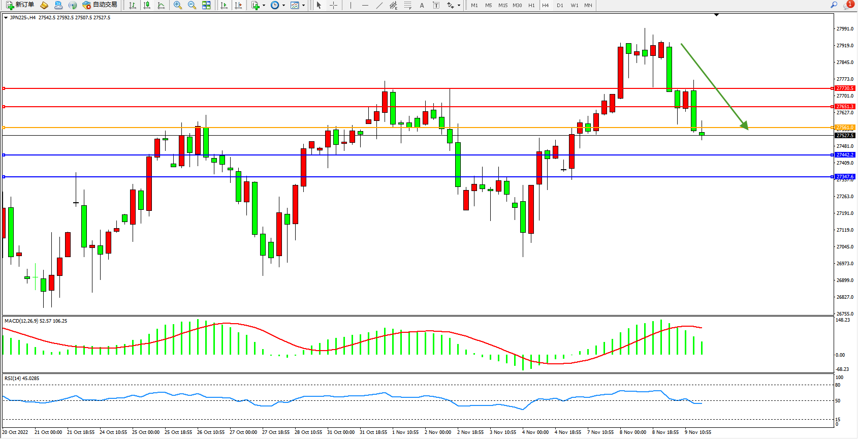 日经指数JPN225——4小时K线图显示: