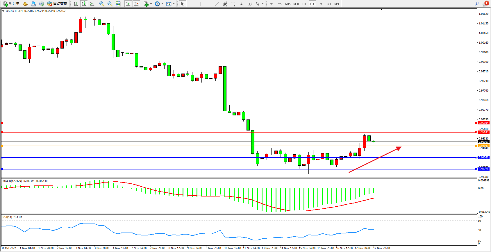 美元瑞郎USDCHF——4小时K线图显示: