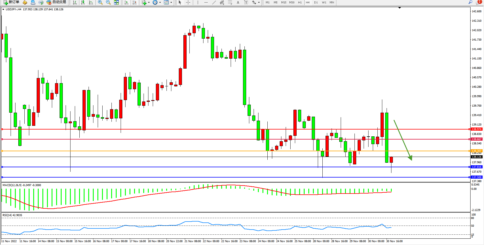 交易策略:138.307下方看跌,目标137.816、137.500