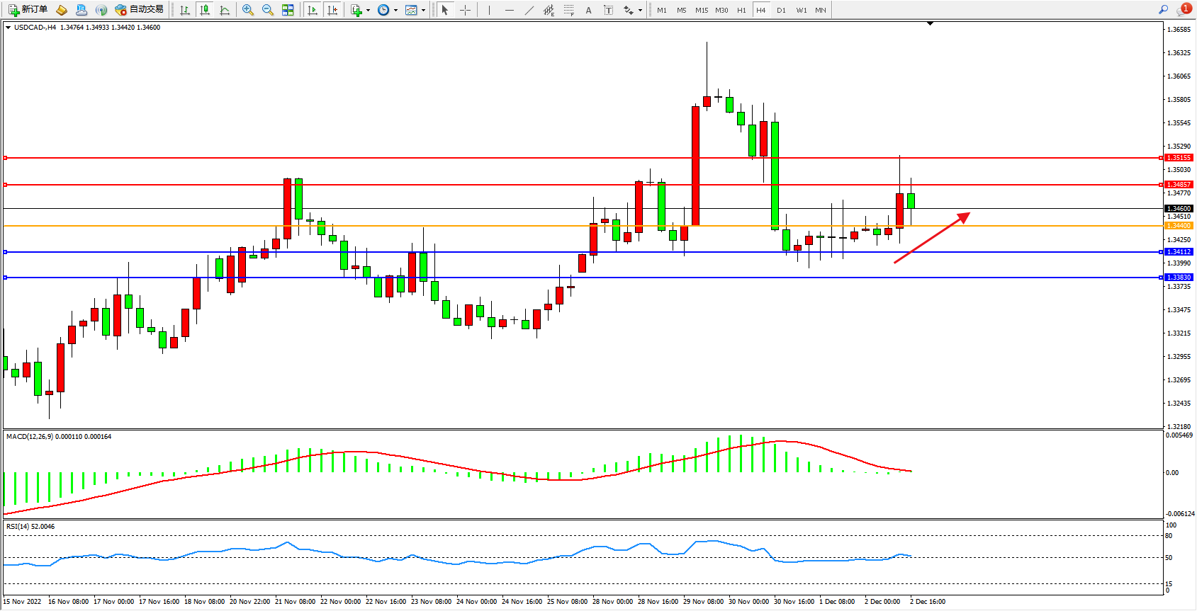美元加元USDCAD——4小时K线图显示: