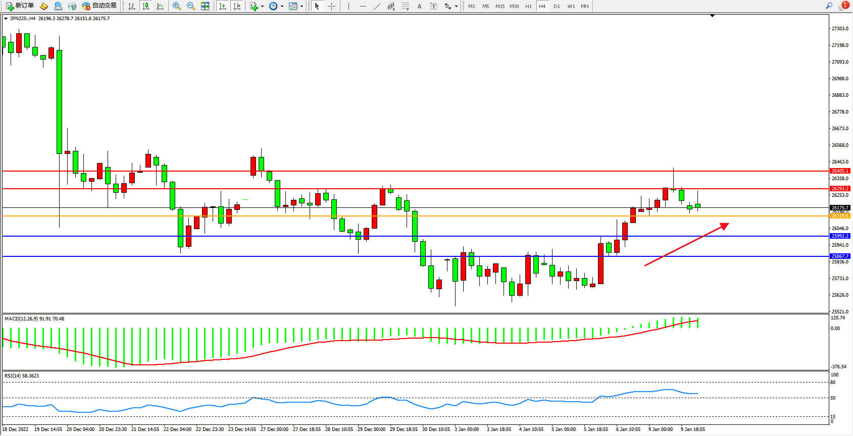 日经指数JPN225——4小时K线图显示: