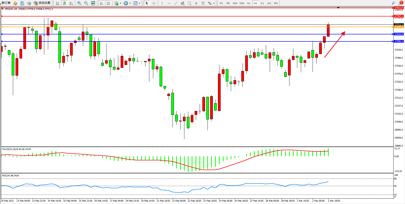 日经指数JPN225——4小时K线图显示: