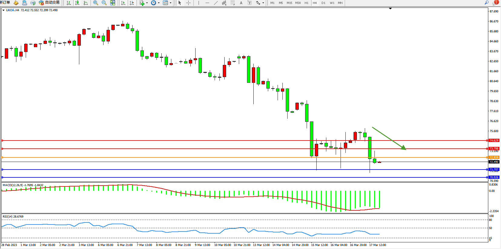 交易策略:72.939下方看跌,目标71.707 70.926