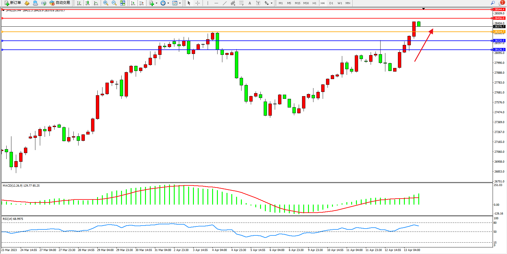 日经指数JPN225——4小时K线图显示: