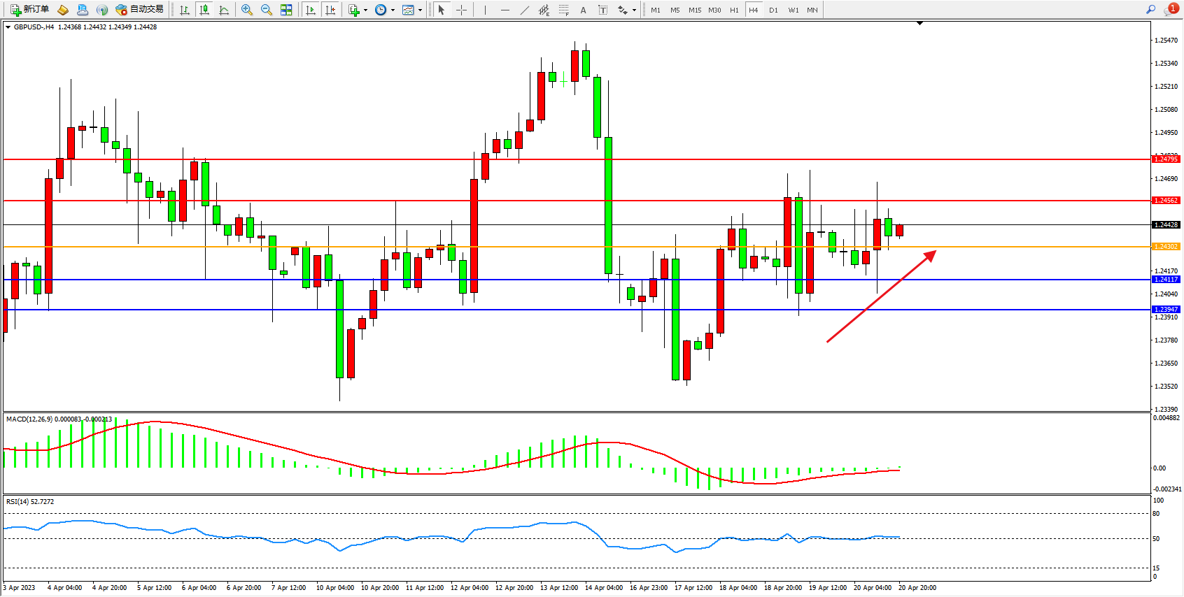 交易策略:1.24302上方看涨,目标1.24562  1.24795