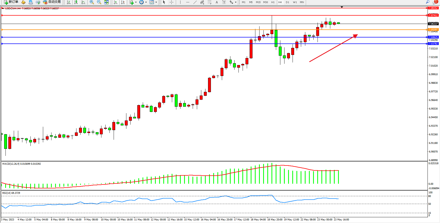 交易策略:7.05597上方看涨,目标7.07412 7.08352