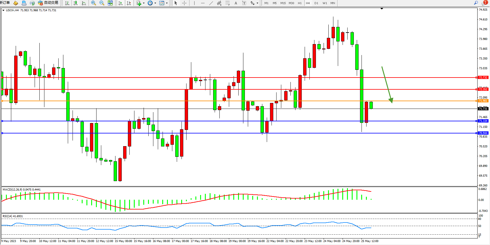 交易策略:71.981下方看跌,目标71.334  70.944