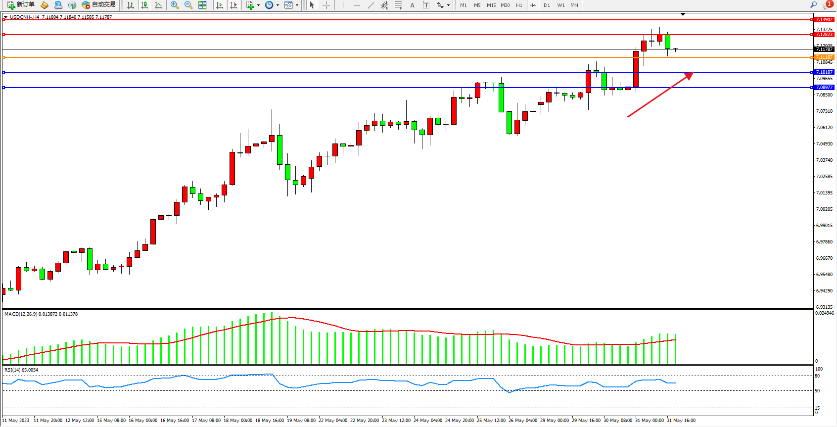 美元人民币USDCNH——4小时K线图显示: