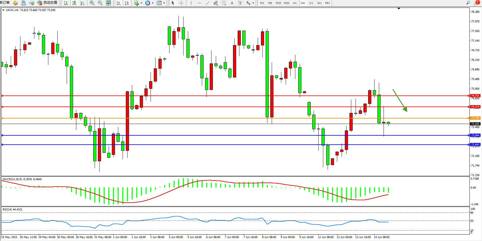 交易策略:73.784下方看跌,目标73.044  72.643