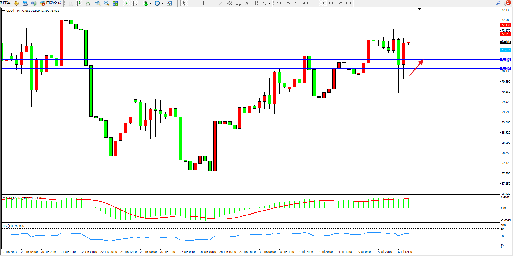 原油USOil——4小时K线图显示: