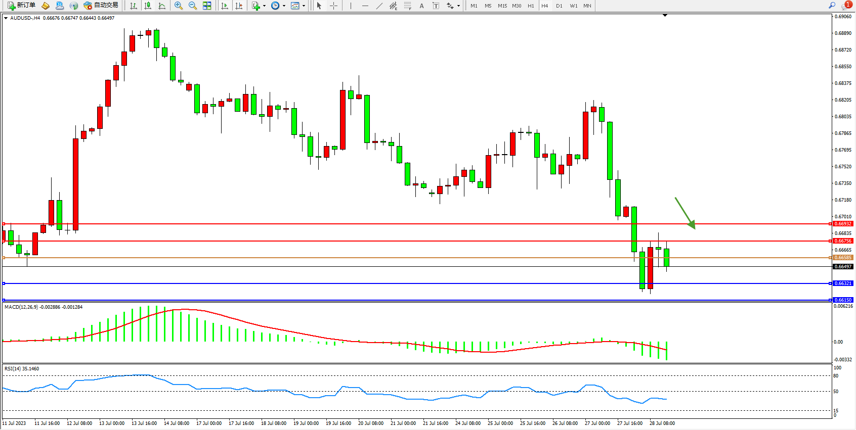 交易策略:0.66585下方看跌,目标0.66321  0.66150